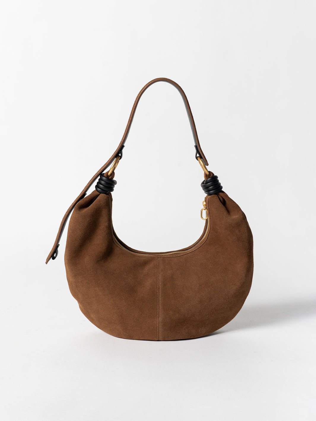 Hand-crafted with care from the finest suede leather, the suede Dumpling Bag boasts a timeless elegance accented by bespoke brushed brass gold hardware and a gold foil embossed logo. The exterior features our signature knot design and fixed brushed gold connector clips.