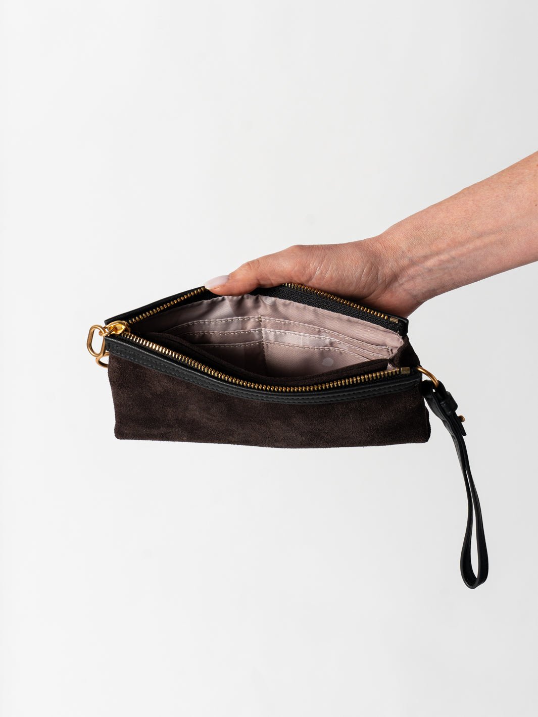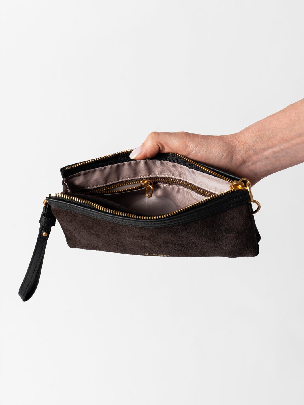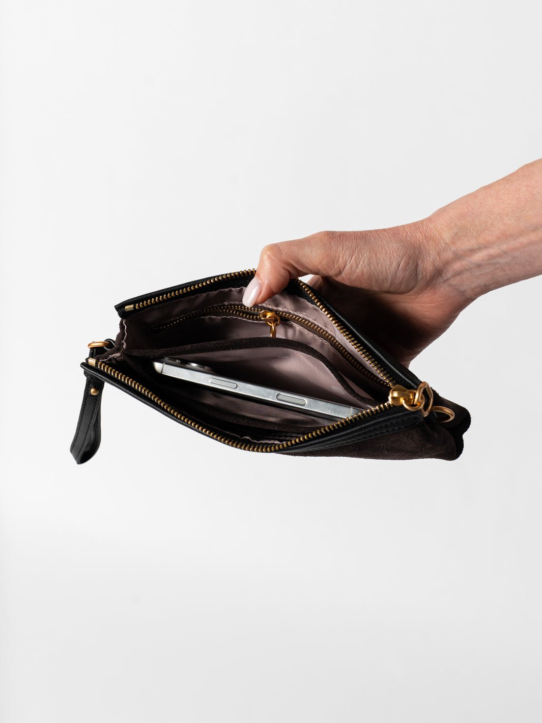Designed for seamless organisation. Crafted from the finest suede leather leather, this pouch is as functional as it is beautiful. The interior features a built-in wallet with six card slots, a convenient centre pouch for cash, and a zipped pocket to securely hold coins or small valuables. Our custom waterproof lining and light interior provide peace of mind and easy visibility, ensuring you can find everything you need at a glance.
