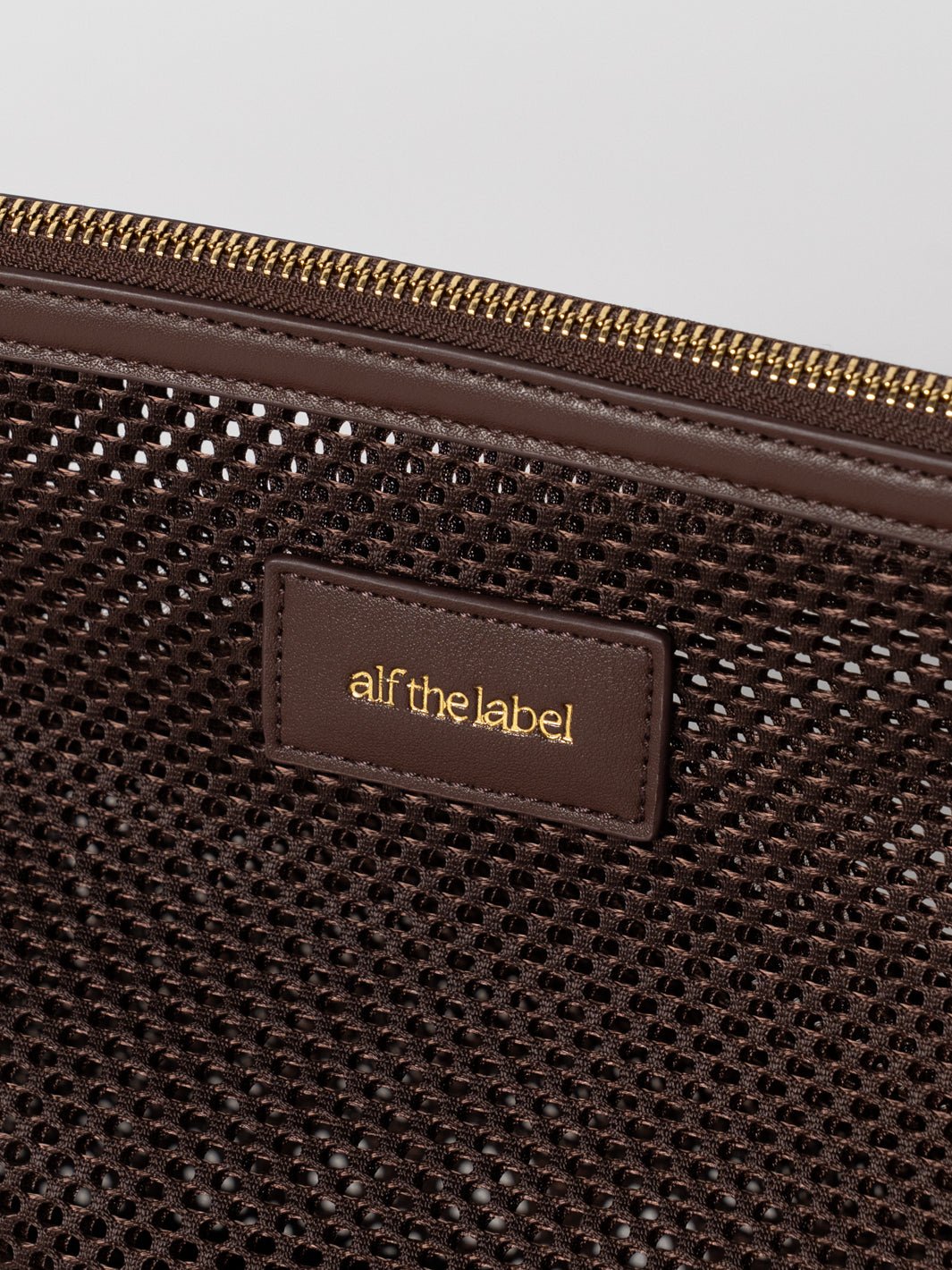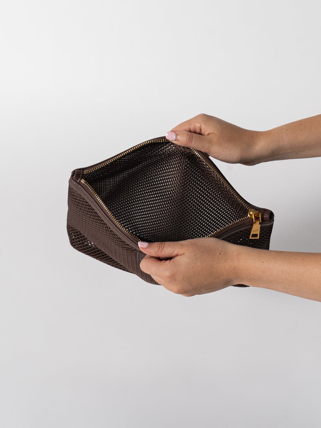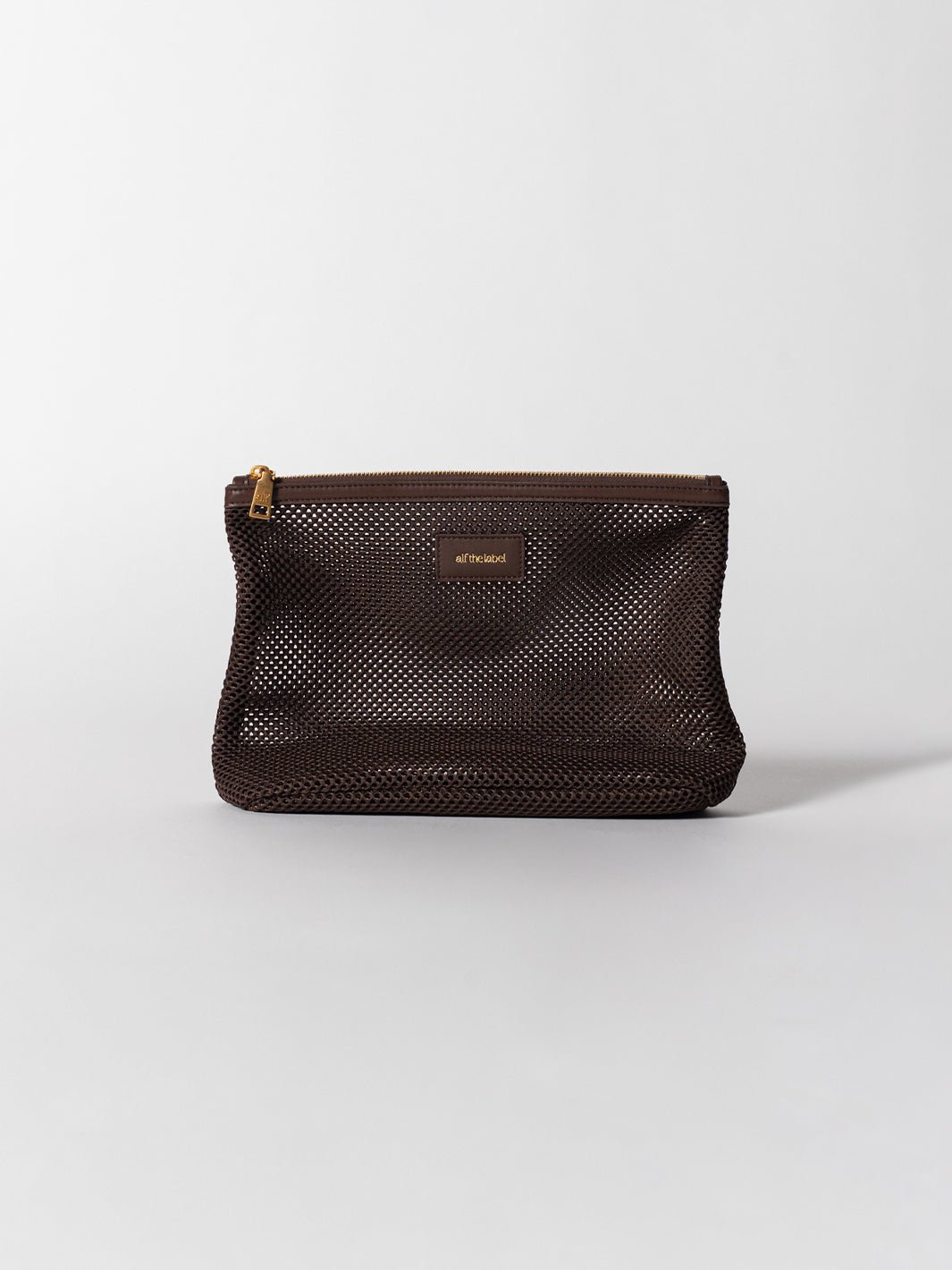 Hand-crafted in durable, lightweight mesh, the pouch features vegan leather trims and our statement brushed gold hardware.