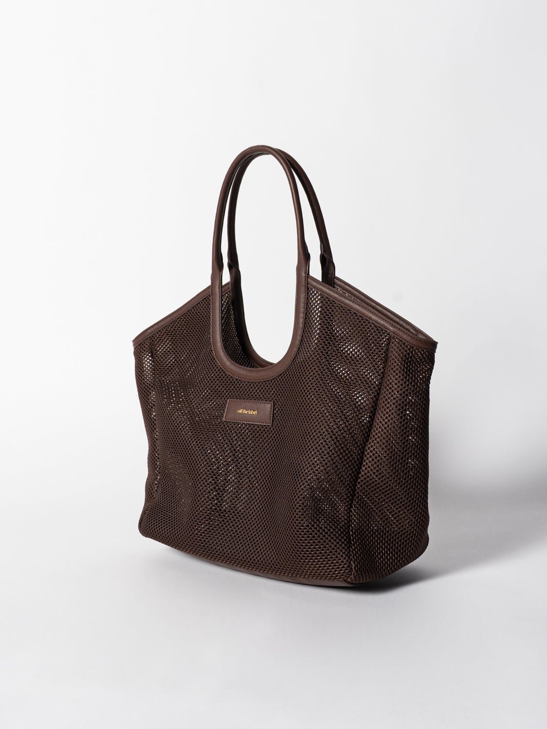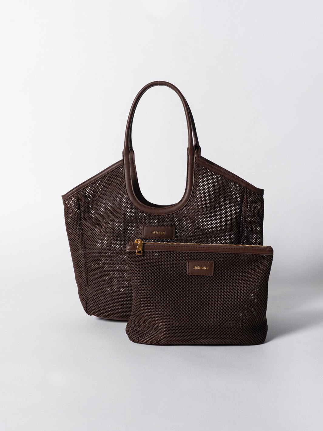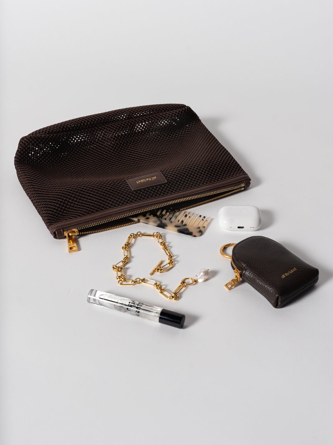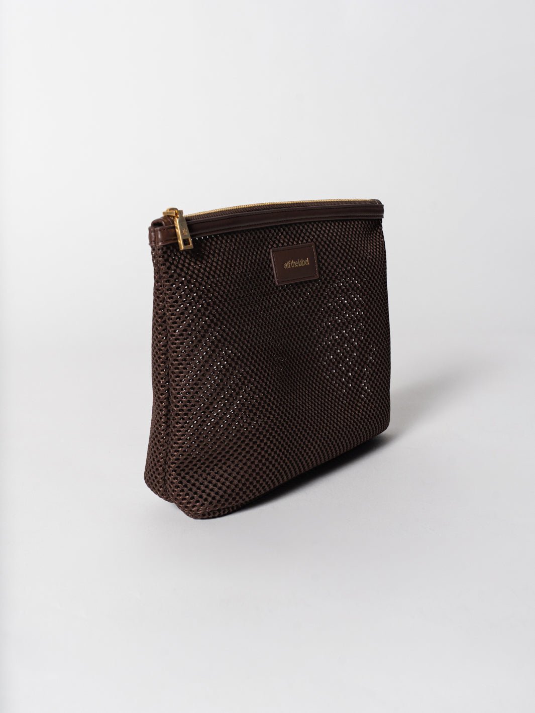 Hand-crafted in durable, lightweight mesh, the pouch features vegan leather trims and our statement brushed gold hardware.