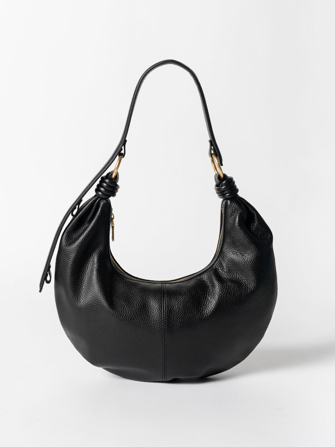 Hand-crafted with care from the finest full-grain pebbled leather, the luxe Dumpling Bag boasts a timeless elegance accented by bespoke brushed brass gold hardware and a gold foil embossed logo. The exterior features our signature knot design and fixed brushed gold connector clips.